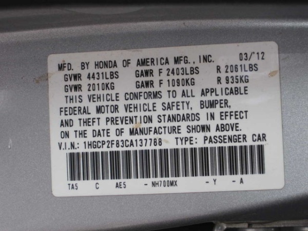 VIN: 1HGCP2F83CA137788
