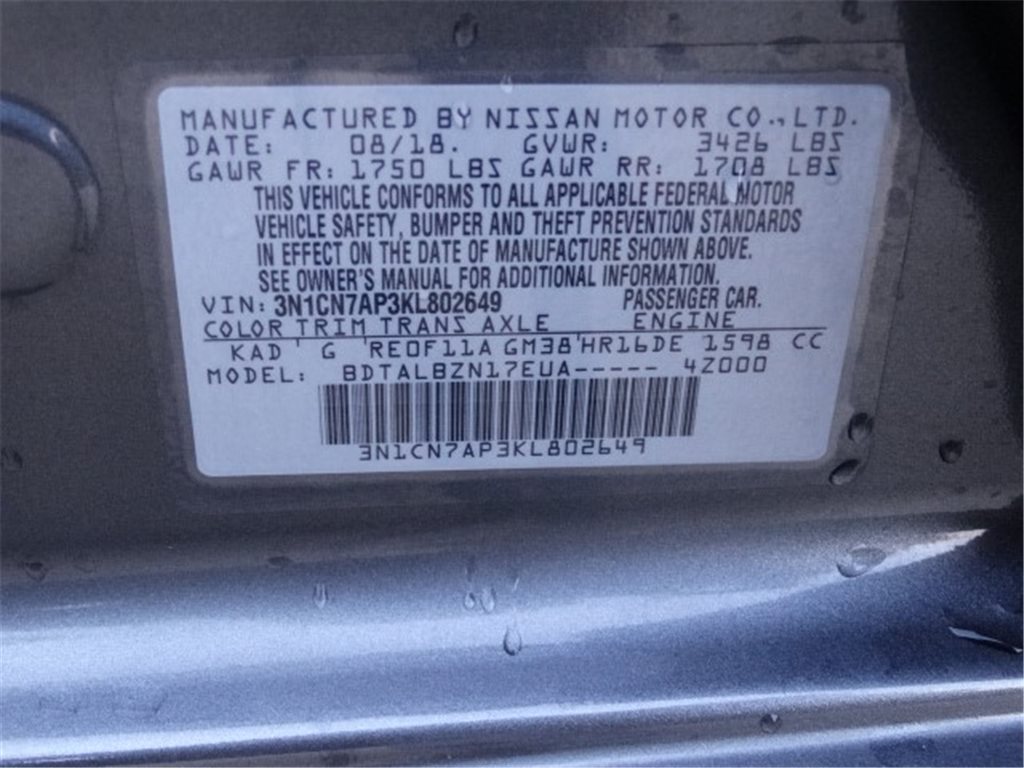 VIN: 3N1CN7AP3KL802649